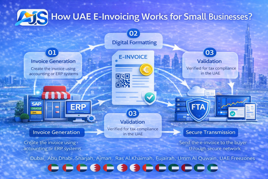 How UAE e-invoicing works for small businesses infographic with AIS logo showing invoice generation, digital formatting, validation, and secure transmission to the UAE FTA.