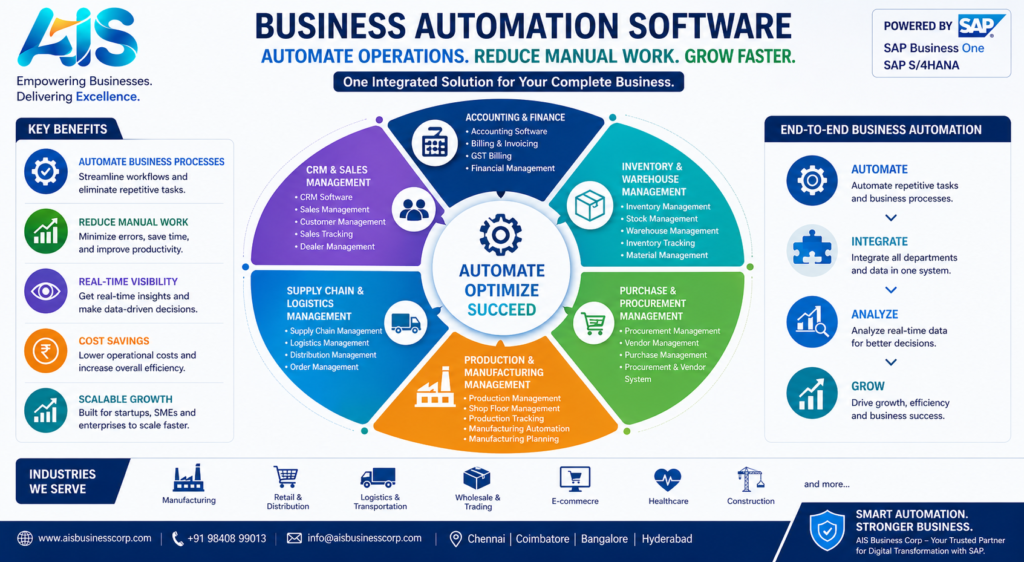 Business automation software is a digital solution that automates repetitive tasks and business workflows across departments such as finance, sales, inventory, production, and supply chain.
