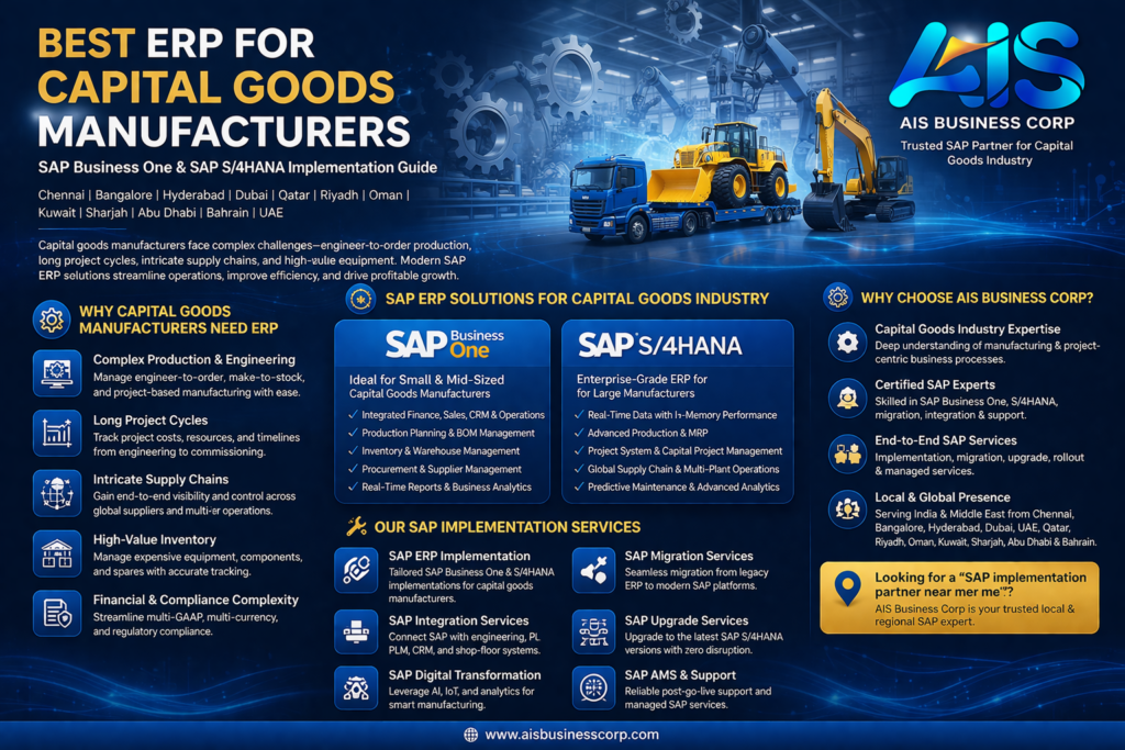 Organizations searching for trusted SAP implementation partners near me across Chennai, Bangalore, Hyderabad, Dubai, UAE, Qatar, Riyadh, Oman, Kuwait, Sharjah, Abu Dhabi, and Bahrain often look for experienced SAP consultants who understand manufacturing and capital goods operations.