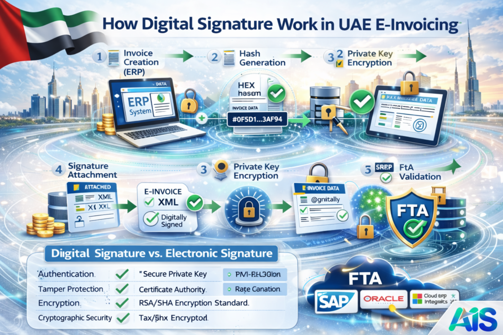 As the UAE e-invoicing mandate evolves toward 2026, companies operating in Dubai, Abu Dhabi, Sharjah, and across the Emirates must understand how digital signatures work, when they are required, and how to implement them properly within their ERP systems.