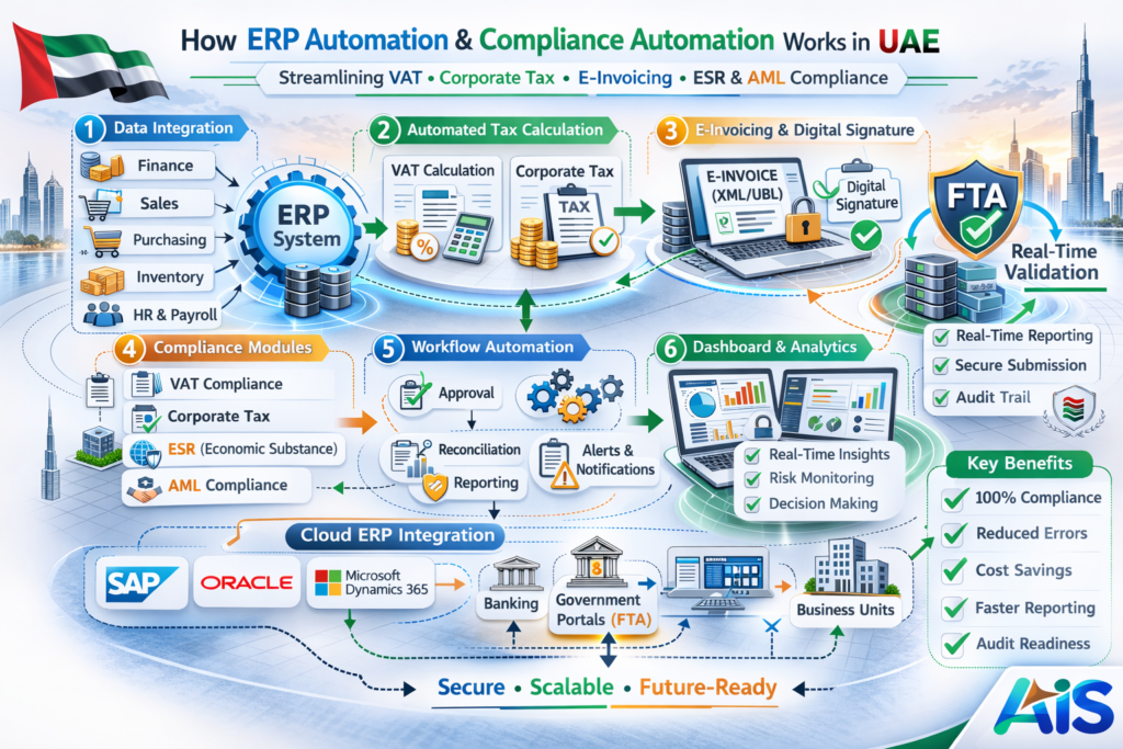 ERP Automation and Compliance Automation in UAE infographic showing VAT automation, corporate tax reporting, e-invoicing, FTA submission and real-time compliance dashboard by AIS Business Corp