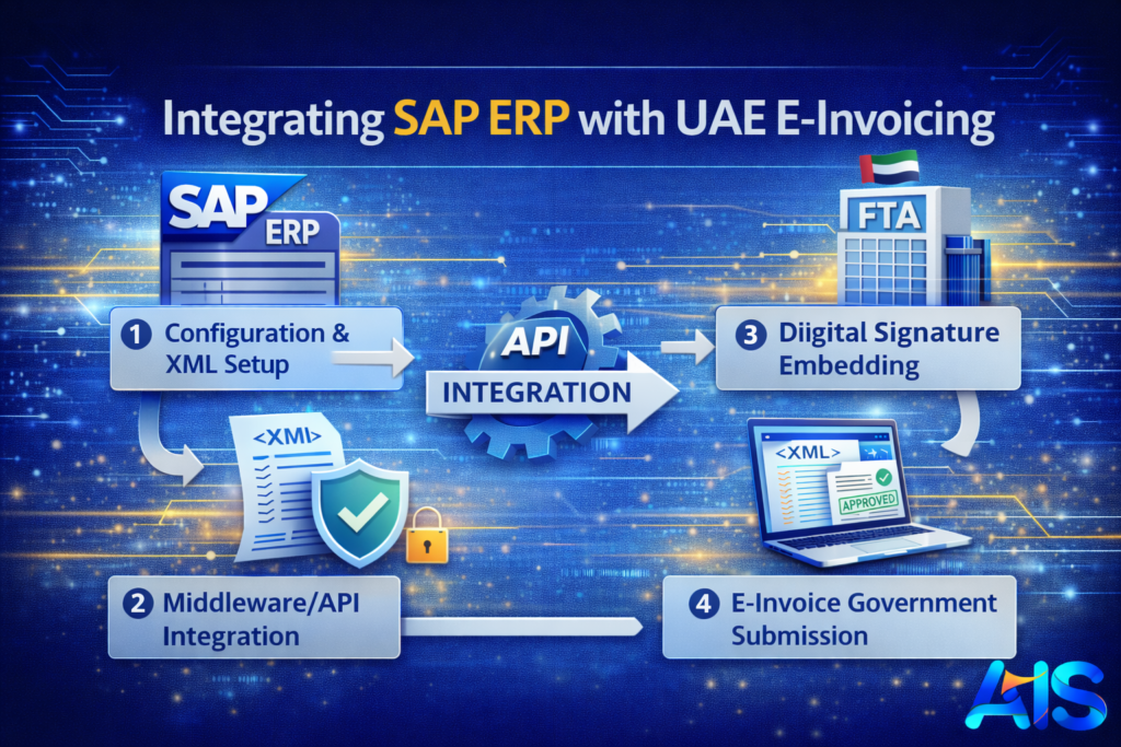 SAP ERP integration with UAE e-invoicing system banner showing XML invoice, API connection, digital signature, FTA compliance elements