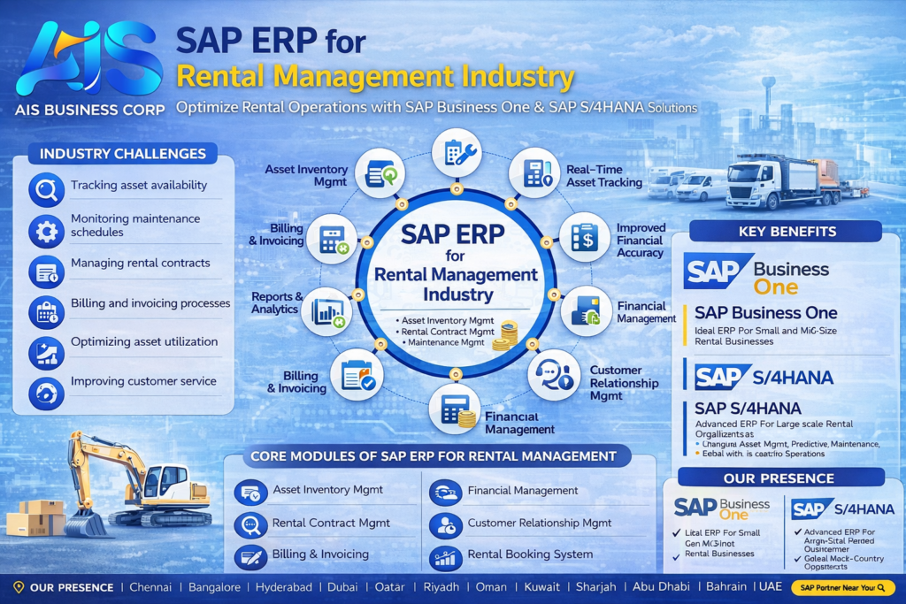Organizations looking for a trusted SAP rental management solution provider near me in Chennai, Bangalore, Hyderabad, Dubai, Qatar, or UAE can implement SAP ERP to digitally transform rental operations.