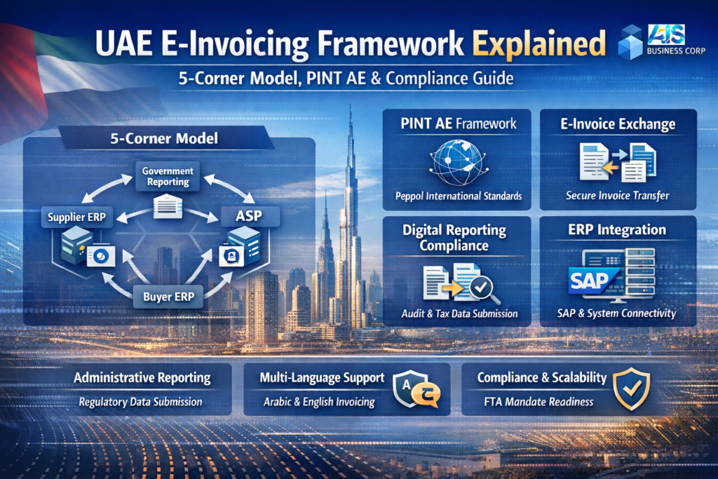 UAE e-invoicing framework explained showing 5-corner model, PINT AE standards, ASP exchange, ERP and SAP integration with digital reporting compliance by AIS Business Corp