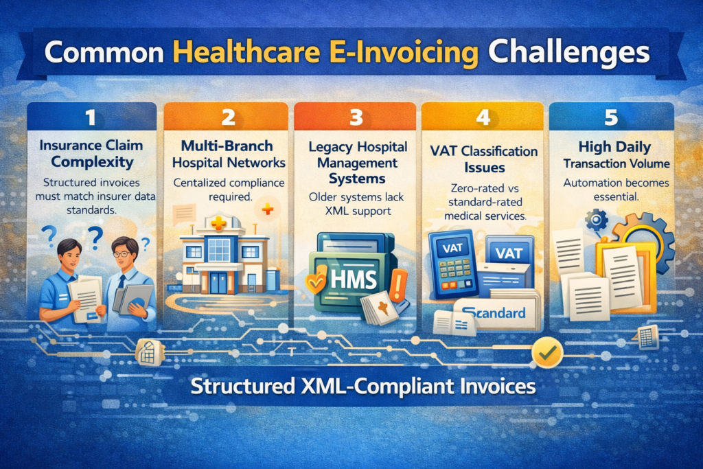 Common healthcare e-invoicing challenges in UAE including insurance claim complexity, multi-branch hospital networks, legacy systems, VAT classification issues and high transaction volume